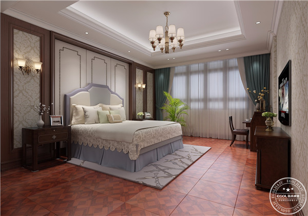 臥室完美地展現了樸實無華的美式鄉村田園風情。地板、床、墻紙都選用了米色或褐色這一色系,整體風格非常統一,整個房間洋溢著古樸自然的氣氛。