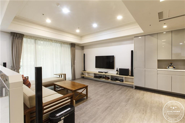 電視柜與裝飾收納柜、書柜合體,滿足多種收納需求,也讓空蕩的墻面看起來更加雅致,電視組合柜設(shè)計(jì)可以讓房間看起來更加整齊,同時也可以騰出了更多的活動空間。貼墻懸掛的電視調(diào)節(jié)好正確的視覺高度,讓觀看更舒適。有設(shè)計(jì)感的吊柜增加客廳的時尚感,也更加有效利用空間,空出地面空間。