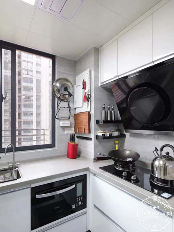 原諒我磁力刀架上面沒有放刀,我老公總擔心會掉下來,大紅色刀架有點礙眼,沒辦法,雙立人只有這個套裝性價比最高。為了省錢把U型廚房改成L型,后來發現置物不夠,又定制了一組柜子,用來放各種小物品,還真的蠻實用的。