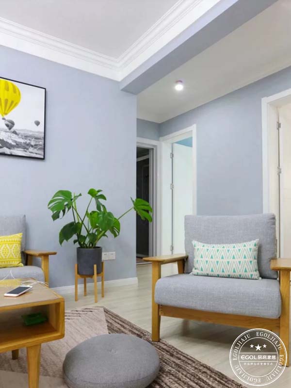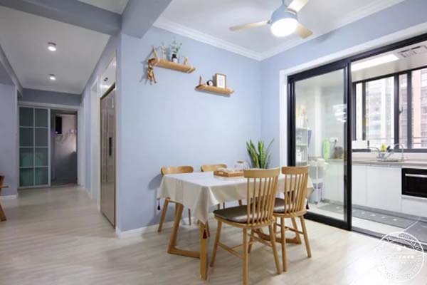 喜歡簡單明亮的北歐風,整個餐廳客廳都是采用藍灰色調打底,這個顏色硬是讓師傅調了整整三個小時才給整出來,哈哈本來想用文化磚,后來發現網上買的都是瓷片磚,工人鋪貼費用就要一兩千,最后果斷放棄,無意中發現硅藻泥也有這種類似文化磚的式樣,就做了硅藻泥還環保。不喜歡那種大大小小密密麻麻的掛畫,選擇了簡單款式,同等大小的掛畫,呼應沙發墻面窗簾的顏色,效果很滿意。