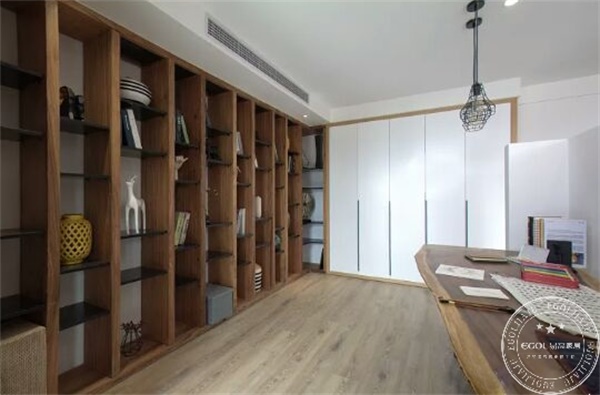 電視墻背后就是書房了,業主要求增加書房空間感,定制出高級感書房。因此,易高家居設計建議地面做一層抬高,使用原木大板做書柜,這樣女主的很多畫作和手工就可以直接擺放展示裝飾。