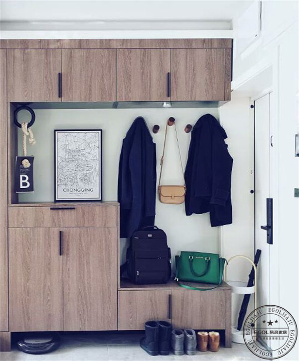 玄關設計安裝組合鞋柜,低柜兼具收納與坐凳功能。鞋柜下全部鏤空,除了可以放拖鞋外,還給掃地機和拖地機預留了兩個插座在靠墻的位置,方便充電。低柜上墻體釘入木樁子,這樣從外面回家,打開門放包、脫大衣、換鞋可以一氣呵成。