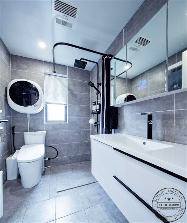 主衛裝修中規中矩,置物架承擔了衛生間儲物的大部分功能,配上風格統的儲物盒,更顯整潔。同時為了徹底干濕分離,選擇砌了一堵薄墻隔開,里面的馬桶區和淋浴區基本上只有一個多平方。