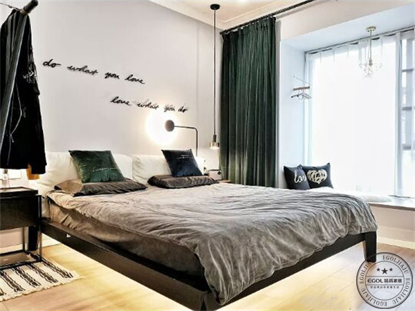 主臥設計簡簡單單,基本上就只有一張床睡覺。軟裝選擇了全遮光的墨綠色絲絨窗簾,拉起來完全分不清白天黑夜。大床一側的床頭柜,可以說是最有用的小家具。