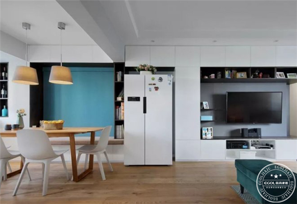 客餐廳之間的梁在細節上也進行了處理,從頂上延伸下來的立面用開放展示格來收納一些小物件或小飾品。電視背景和冰箱,卡座,收納融為一體,讓整個區域整齊,大氣,電視柜的深色展示層板和底色與白色的收納形成對比,整個空間清爽溫馨。