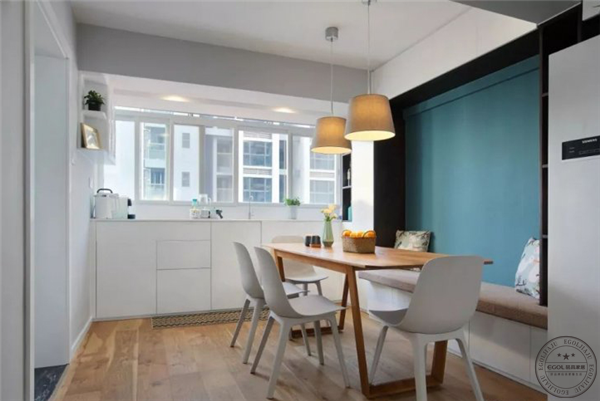 將生活陽臺納入餐廳,讓餐廳空間加大,把陽臺窗戶時起來沿窗戶做一排一米高的矮柜。作為西廚的操作臺,餐桌的功能就更多元化了,可當島臺、學習桌、就餐區。