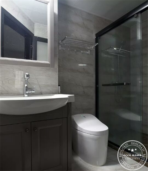 洗手間的馬桶用智能的,洗手臺(tái)采用的是鏡柜設(shè)計(jì),再也不要擔(dān)心無(wú)處安放的化妝品,納鞋底瓶瓶罐罐了。