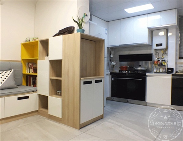 客廳與廚房之間,很好地運用了折疊桌作為隔斷,可以看成是餐桌,也可以看成是孩子的書桌。在平常做飯的時候,還能督促孩子學習,也能促進孩子和家長之間的交流,工作學習兩不誤。這樣的布局有助于拉近之間的距離。