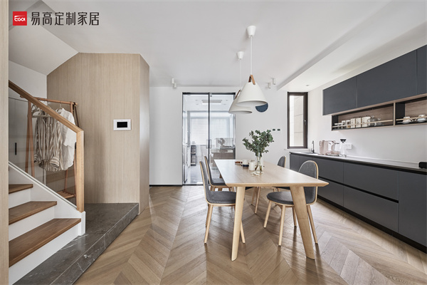 餐廚一體化設(shè)計(jì)就是將廚房和餐廳結(jié)合在一起,開放式的廚房和餐廳一起可以擴(kuò)大空間,提高空間的利用率,從而讓空間看起來更是舒適自然。這種