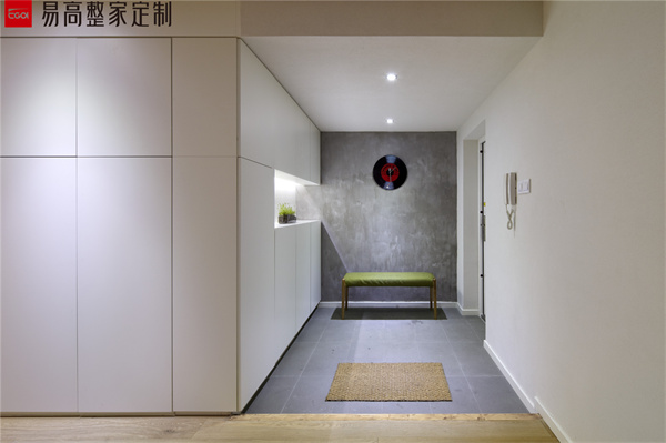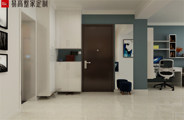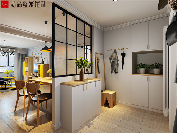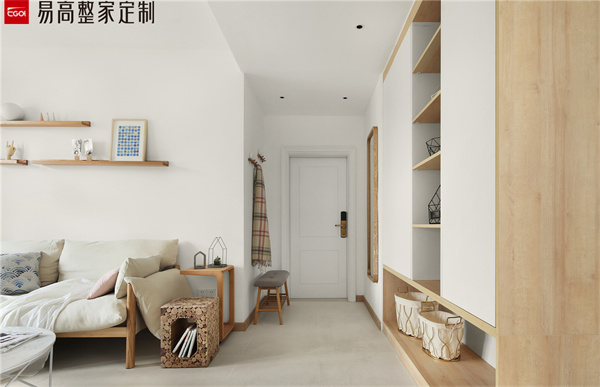 玄關處可以定制一個頂天立地的卡座式的玄關柜,門柜一體化設計和墻面相結合,不僅可以鞋物收納還有隨手物品的擺放需求,而且卡座式的設計可以滿足坐著換鞋的需求性。這種設計非常實用,特別是對于老人和小孩來說,換鞋更加便利了。