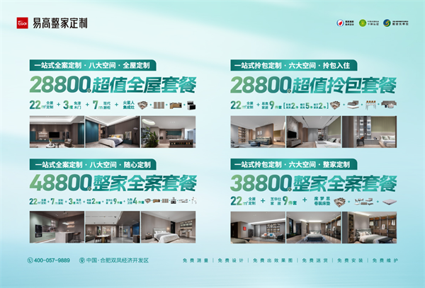 易高整家定制為消費者提供一體化整家設計、一體化產品交付、一站式售后服務,滿足多樣化需求。基于此,易高推出多種裝修套餐,以滿足不同預算的客戶。