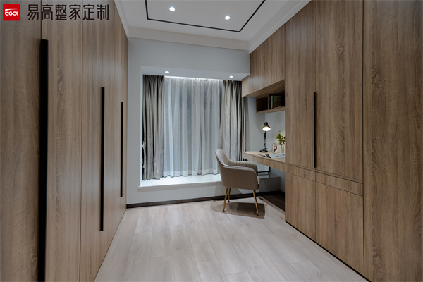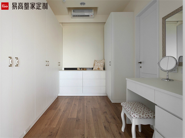 超大的L型衣帽間設計,具有強大的儲物功能與實用性,與梳妝臺一體化的設計,讓梳妝穿搭一并搞定,從細節處提升幸福感。簡約的線條、考究的比例,以及井然有序的設計感,讓空間更加整潔舒適,有種隱約的流動美感。家裝的個人品味也滲透在細節之處,整個衣帽間通透性設計,更顯時尚感。