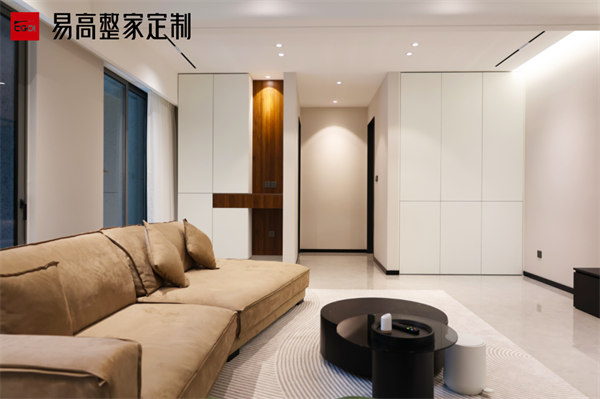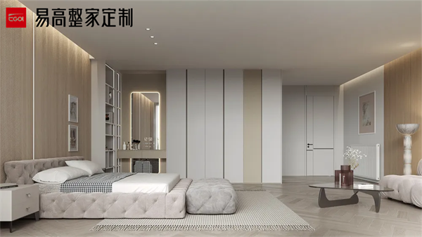 細節處理直接影響衣柜的美觀和實用性。例如,頂封板應內置,避免外露;左右封板應與柜體同厚,避免太寬影響美觀;為了整體美觀,柜體露出的側面應加門板同色的見光板;柜門建議使用極簡的長拉手或無拉手設計,如內置反彈器,以體現極簡風格。