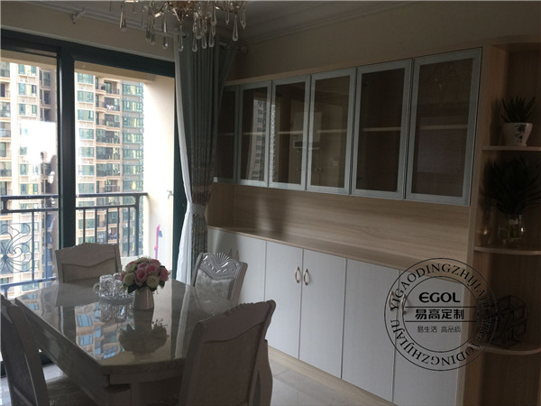 餐廳的餐桌是可以伸展的這種,玻璃面的,人少的時候可以折疊一下,人多的時候,可以拉伸變成圓桌,以滿足大家的需求。餐廳的一邊做了一套定制的儲物柜,用來放置一些雜物,也讓整個房間看上去整潔。
