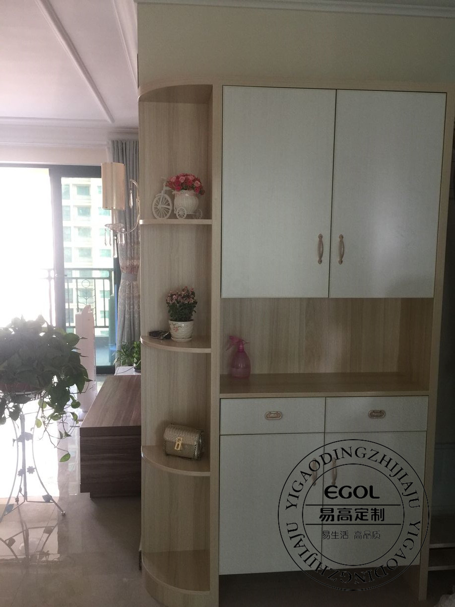 入門處做的定制的鞋柜,配上轉角柜,讓整個柜體顯得圓滑,也不容易傷人,下面鏤空,就是為了放換下來的鞋子。