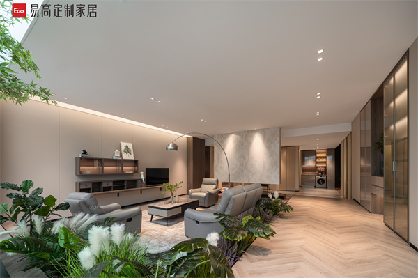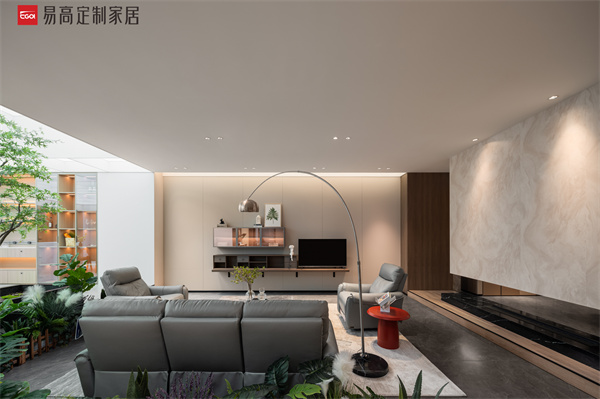 整體布局開闊明亮,運用深淺色系的碰撞豐富視覺層次,增加時尚感。懸浮式電視柜和收納柜摒棄復雜裝飾,以流暢線條勾勒簡約隨性的生活姿態,呈現純凈優雅的休閑會客空間。一抹綠植的加入釋放空間無限活力,北歐風情滿滿。