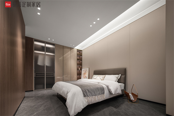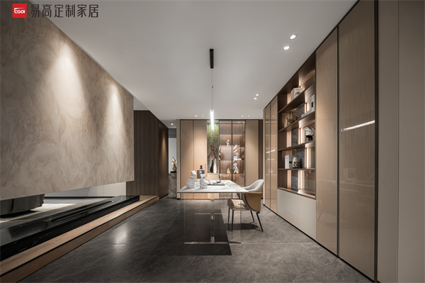 臥室、書房一體化設計,在滿足日常休息需求的同時迎合居者對精神世界的內在追求。通頂書柜設計大氣高挑,流金歲月柜門在光影聯動下呈現流光溢彩的神秘美感,為空間注入優雅韻味。松弛治愈的氛圍在空間彌漫開來,入夜便是酣夢一場。