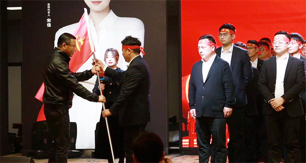 戰(zhàn)鼓催征,易高家居董事長孔慶松為全體戰(zhàn)士親授戰(zhàn)旗,現(xiàn)場士氣高漲。臨行前,易高鐵軍喝下壯行酒,并以鏗鏘有力的誓詞宣告對任務(wù)目標(biāo)的完美執(zhí)行,彰顯出使命必達(dá)的決心!