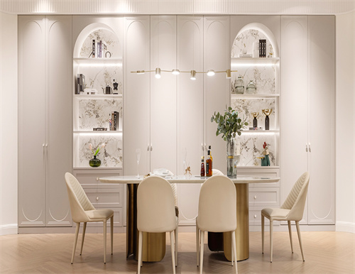 借鑒意式建筑的拱形線條美學(xué),以極簡大氣的圓弧造型進(jìn)行整體鋪陳,形成親切的天然違和感,促進(jìn)空間與人的親密互動,提升整體視覺層次感和設(shè)計(jì)張力。