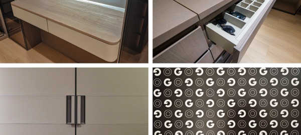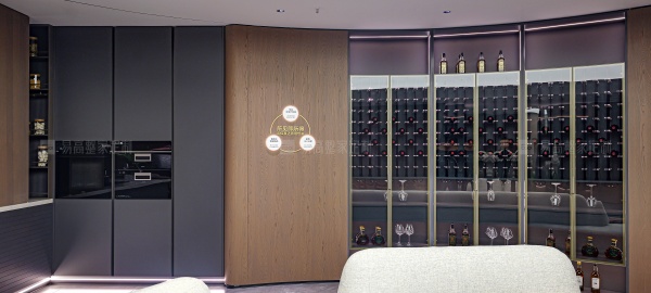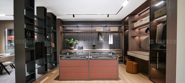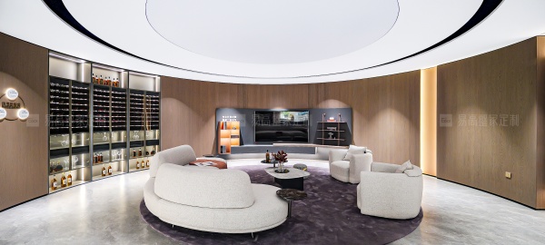 開放式壁掛系統(tǒng)與個(gè)性logo背板形成較大的視覺沖擊力,呈現(xiàn)獨(dú)一無二的奢雅質(zhì)感。玻璃、皮質(zhì)、金屬元素融合柔光氛圍,每個(gè)角落都散發(fā)慵懶高級感。
