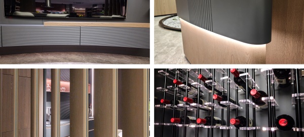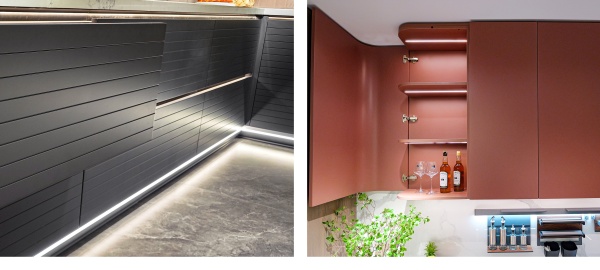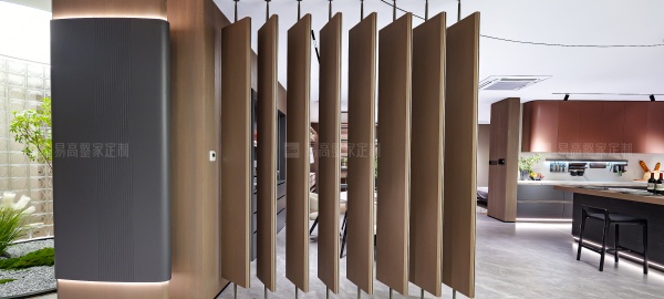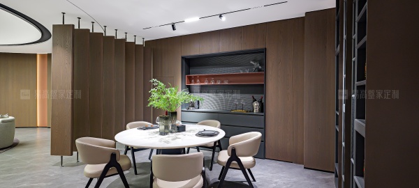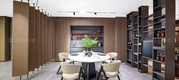 通透的屏風(fēng)和開放格設(shè)計(jì)相輔相成,呼吸感穿梭其中,生動演繹意式美學(xué)的優(yōu)雅與從容。線性燈帶沿著柜體輪廓隨性流淌,明暗交匯間,無限放大光影美感。