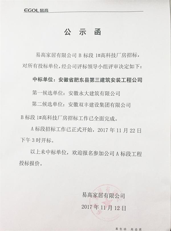 易高家居有限公司B標段1#高科技廠房招標,對所有投標單位,經公司評標領導小組評審決定如下: